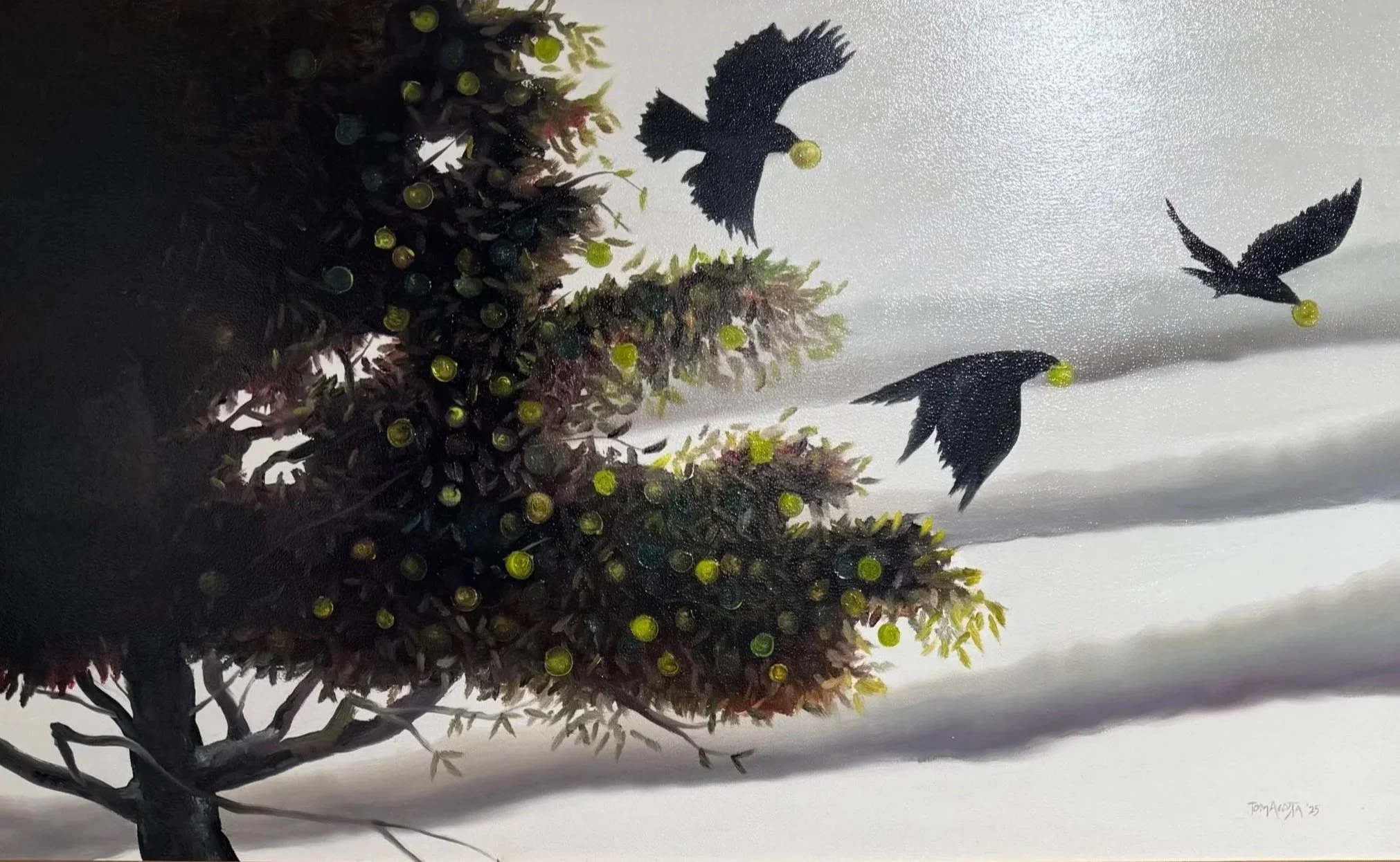 Acosta began his career with oils, and later worked in both watercolor and acrylics. Today, he relies heavily on oil, painted on wood panels. The off-kilter perspective in many of his works challenges viewers to deal with the image personally in their own minds.